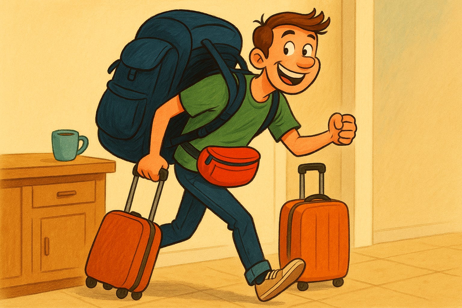 Because at 8:03, he was stalking me in the kitchen—not talking, just hovering—suitcase in hand, fifty-pound backpack strapped to his shoulders, and a larger-than-life fanny pack cinched tightly around his waist like a travel utility belt. His expression said everything: If you’re ready, I’m ready. And I’ve been ready since yesterday.